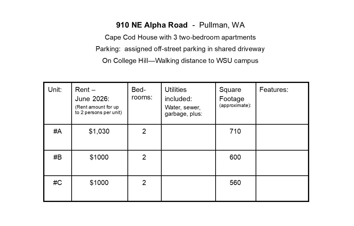 Alpha Road is our 1940’s Cape-Cod. Our family purchased this house in 1952. While we lived on the main floor, we had tenants in apartments above and below us. Each floor houses one unit with two bedrooms and one bathroom. Loads of built-in’s for storage, and no shortage of charm. There is a shared driveway for parking; each apartment has an assigned area.