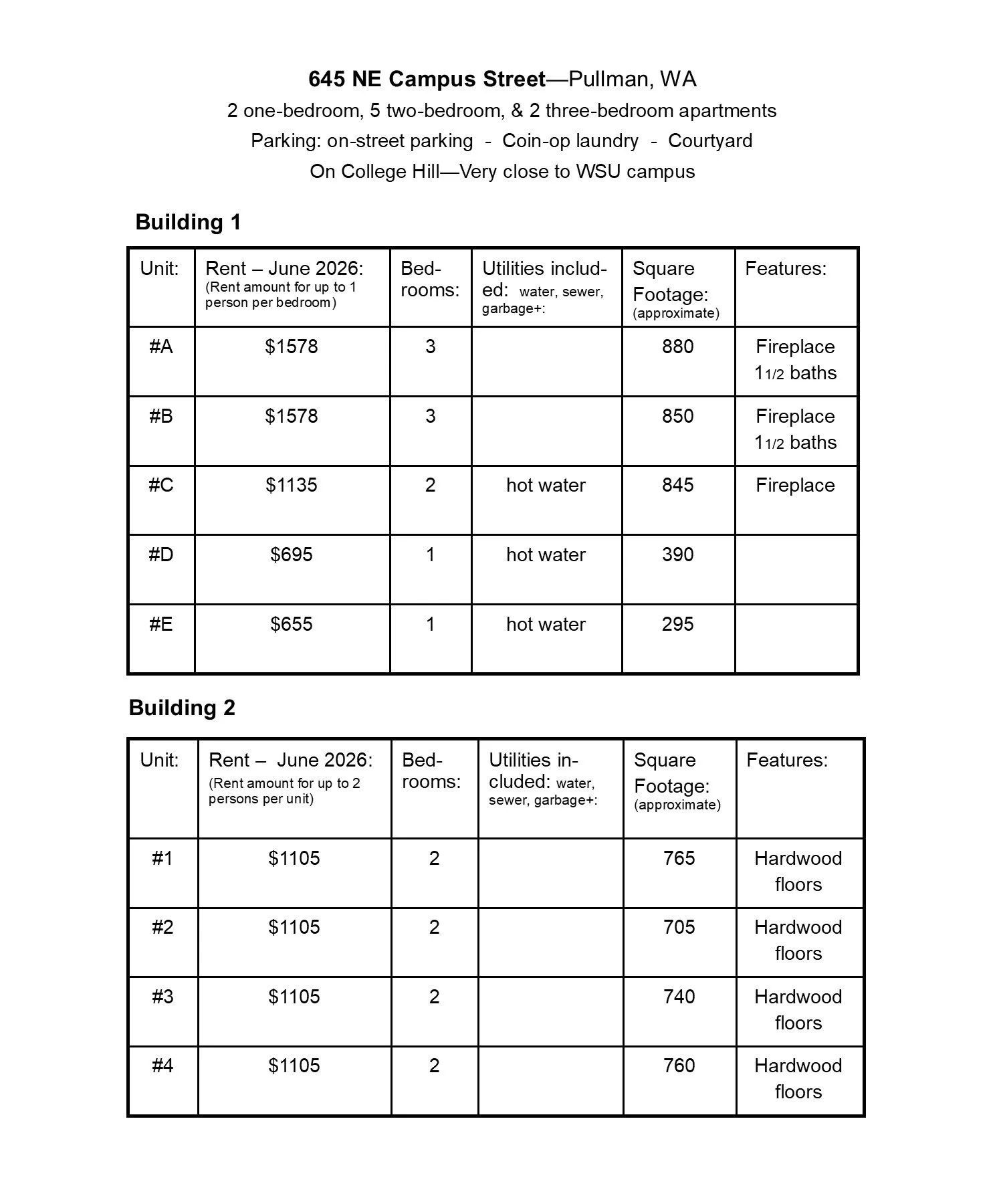 This property is on the corner of Campus and Monroe streets at the east edge of campus in the Greek row area. There are 2 buildings and a courtyard. The property has a 1930s mission architectural vibe. Building #1 faces Campus street and has 5 apartments - 2 three-bedroom, 1 two-bedroom and 2 one-bedroom. The three-bedroom apartments are on two floors, each with a fireplace and hardwood floors. Each unit has a full bath on the main floor and a half bath on the lower level. The two-bedroom apartment has beautiful retro pine paneling, hardwood floors, a large eat-in kitchen, dining area, and a fireplace in the living room. The 2 one bedroom apartments are on the lower level and face the courtyard. There is a coin-operated laundry on the lower level of building #1. Building #2 faces the courtyard and has 4 two-bedroom apartments on two floors - townhouse style. In each unit, one bedroom is on the main floor. The second bedrooms on the lower level are large, have a sink and an outside door. All 4 units in building #2 have hardwood floors on the main floor.