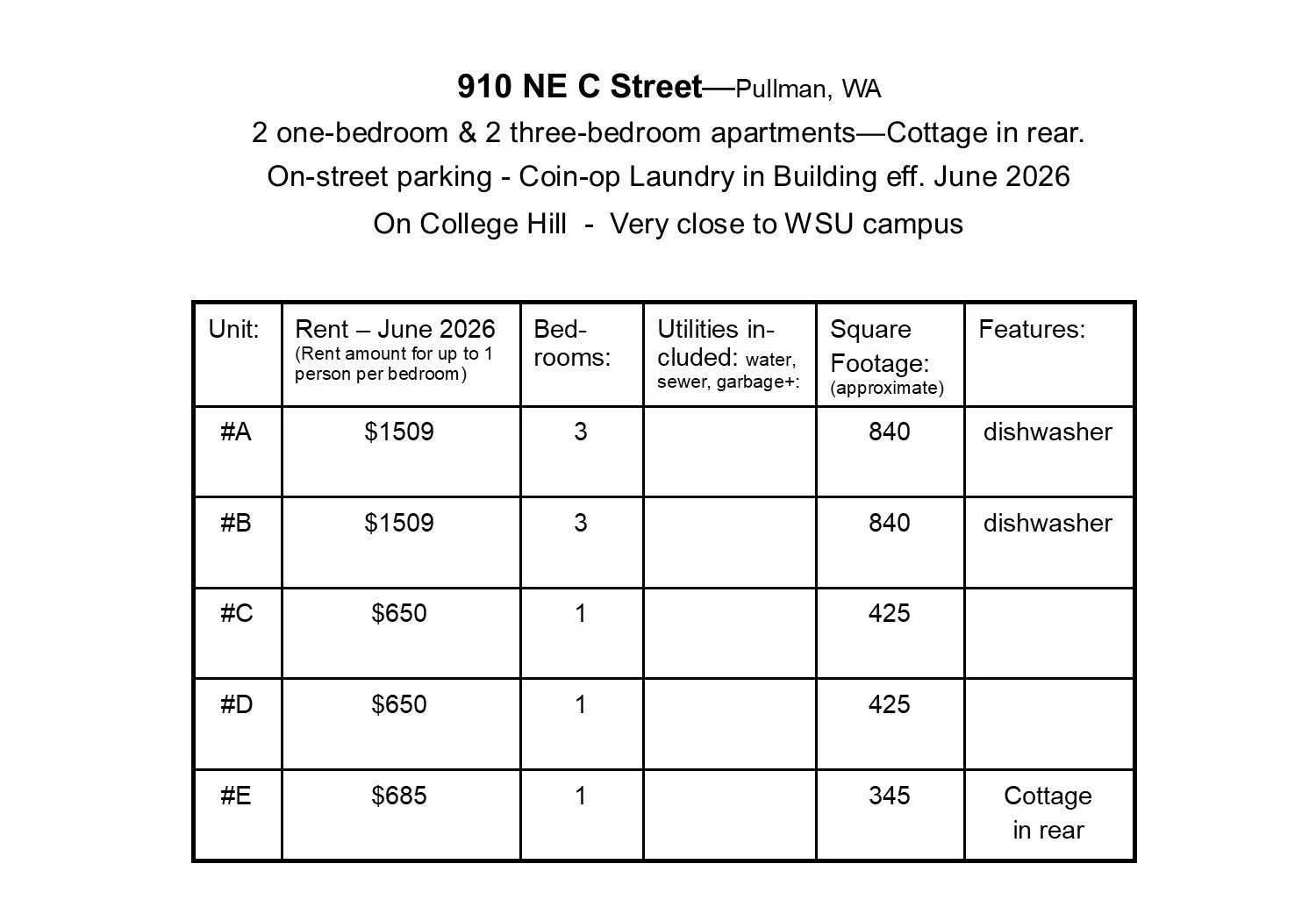 5 units - 2 three-bedroom - 2 one-bedroom - Cottage