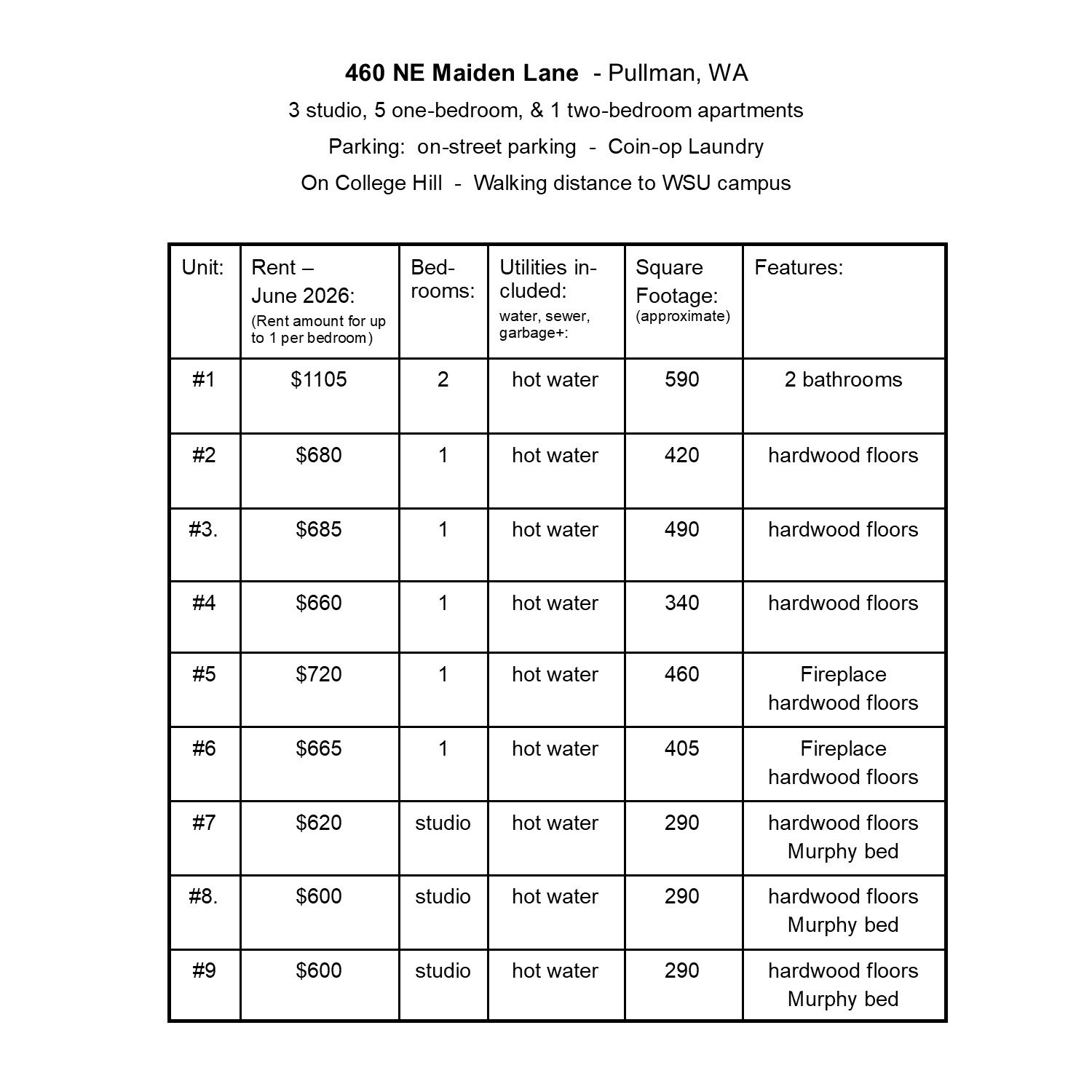 9 units - 3 studio - 5 one-bedroom - 1 two-bedroom-2 bath