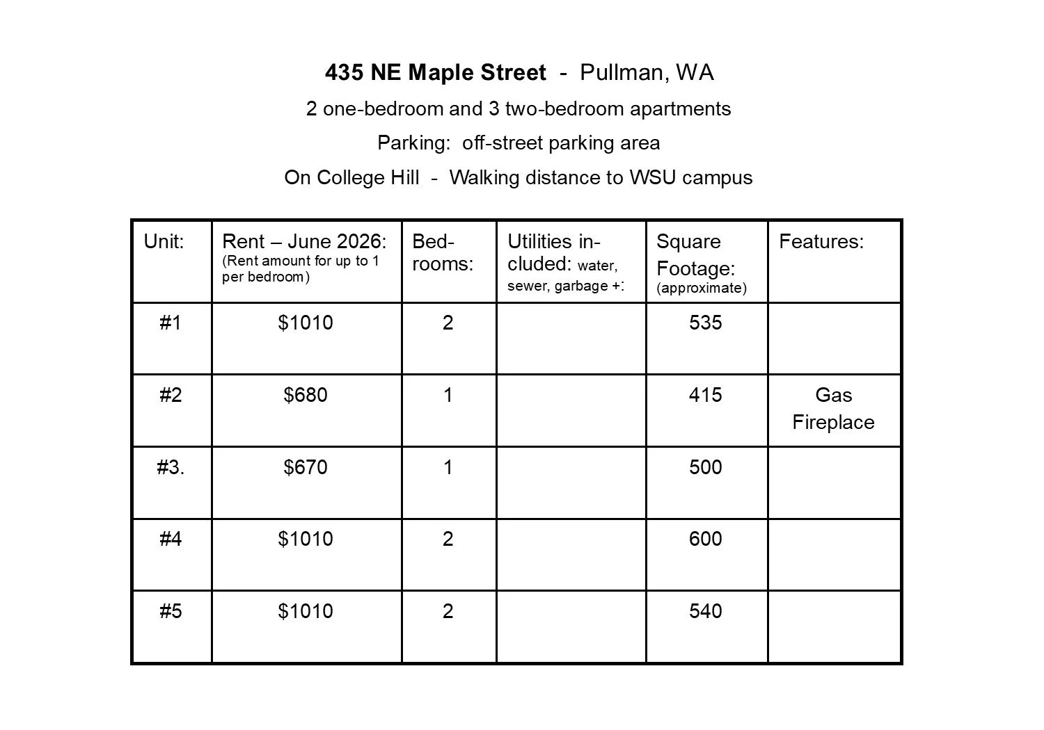 5 units - 3 two-bedroom - 2 one-bedroom